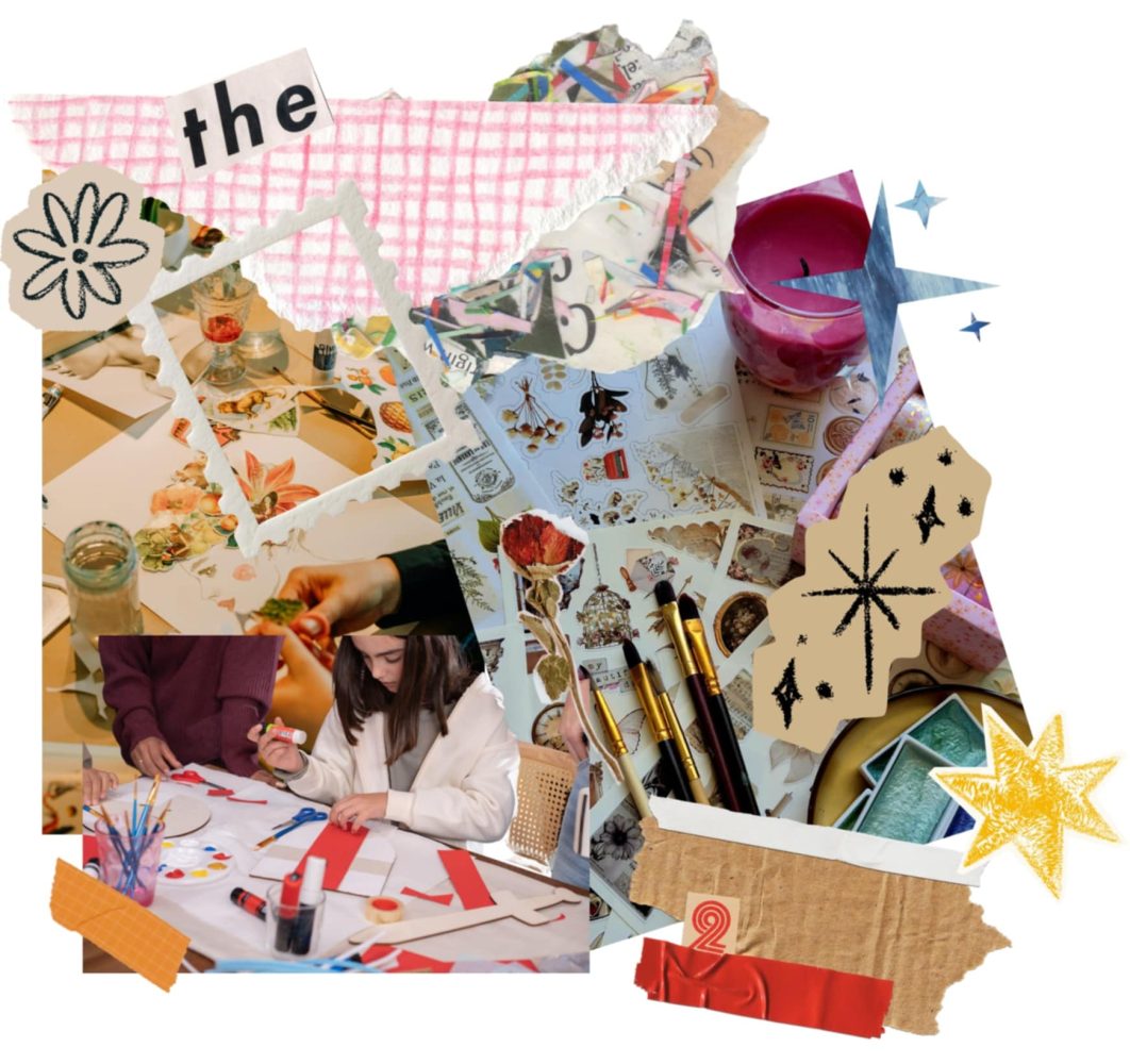 シールや雑誌の切り抜き、いろんな素材のペーパーを組み合わせて
