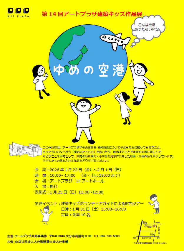 この展覧会は、アートプラザやその設計者 磯崎新氏のことを次世代を担う子ども達に伝えたい、あったらいいなと思う「ゆめのたてもの」を描いたり、制作することで建築や美術に親しんでもらいたいという願いを込めて開催しています。